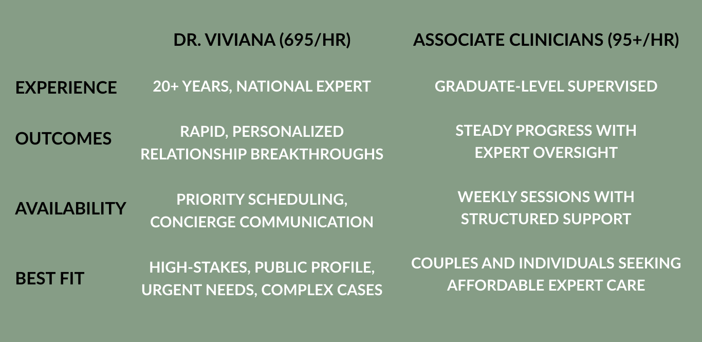 Dr. Viviana has specifically chosen these talented clinicians for their notable skills and professionalism. All of our team members are permitted to provide psychotherapy services in Texas (Dr. Viviana is also licensed in CA, NY, and FL) and are all also able to provide coaching services all over the world where permitted.